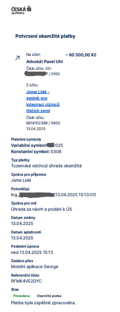 Máme založený účet spolku Jsme Lidé! Můžete nám teď přispět na úhradu práce ústavního právníka. Částka, na kterou vystavil fakturu za sepsání a podání návrhu, činí 60500 Kč.